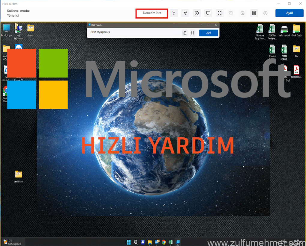 Yardım edecek kullanıcı Denetim iste butonuna tıkladığında ve istemci de onay verdikten sonra karşı kullanıcıyı kontrol edebilirsiniz.