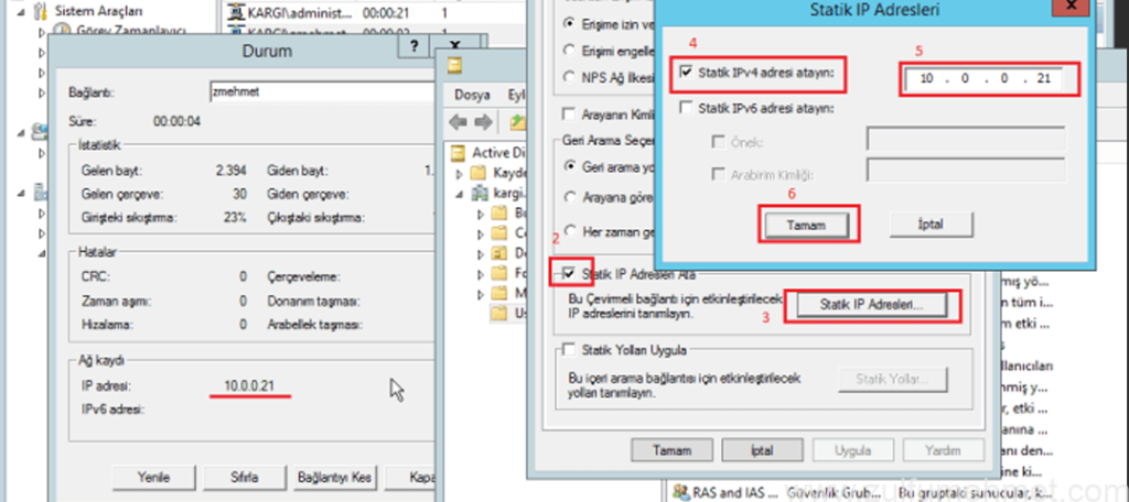 Bu adımları uyguladıktan sonra istediğimiz kullanıcılar bizim belirlemiş olduğumuz ip adreslerini alacaklardır. Durum menüsünden de zmehmet adlı kullanıcının 10.0.0.21 ip adresini aldığını görüyoruz.