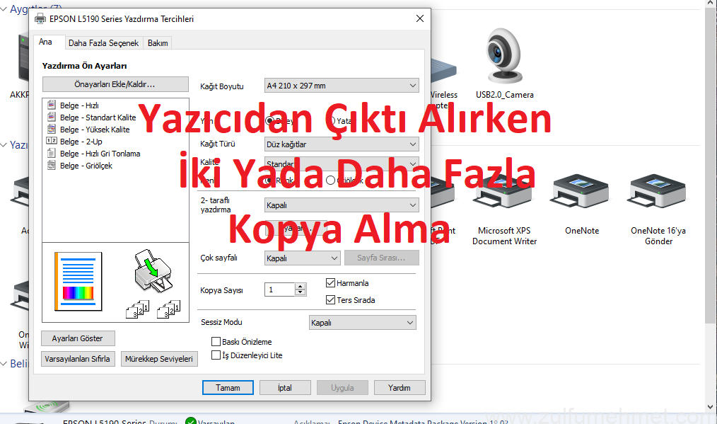 Eğer yazıcınızda yukardaki gibi kopya sayısı seçim özelliği varsa burdan kopya sayısını seçerek istediğiniz kadar kopya çıktı alabilirsiniz. Diğer şekilde bazı yazıcılarda yazdırma tercihlerine bu özellik eklenmemiştir. Yazıcıdan çıktı alırken iki yada daha fazla kopya alma için tek tek yazdırmak gerekebiliyor veya programda sürekli iki yada daha fazla kopya seçmek zorunda kalabiliyorsunuz.
